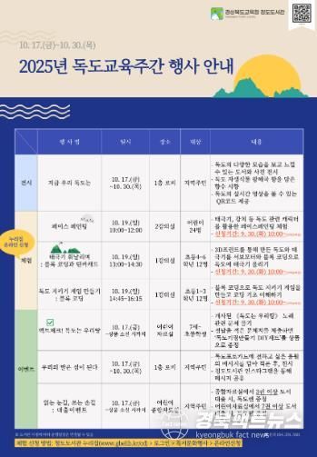 경북팩트뉴스 남유신 기자 | 경상북도교육청 청도도서관은 오는 10월 17일부터 30일까지 지역 주민을 대상으로 '2025년 독도교육주간 행사'를 운영한다.