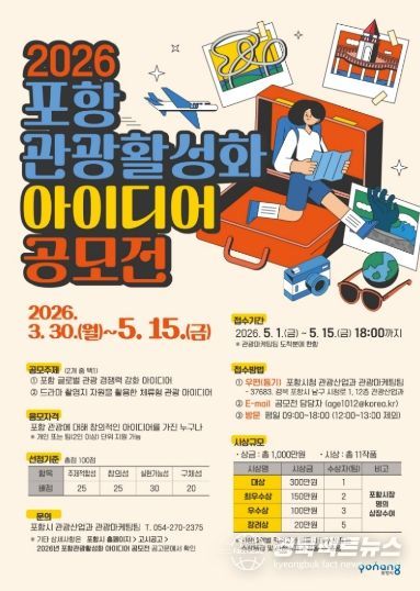 포항시 관계자는 “이번 공모전을 통해 다양한 시각을 정책에 반영할 수 있을 것으로 기대한다”며, “참신하고 실현 가능한 아이디어 발굴을 통해 포항 관광이 한 단계 도약할 수 있도록 많은 관심과 참여를 바란다”고 말했다.