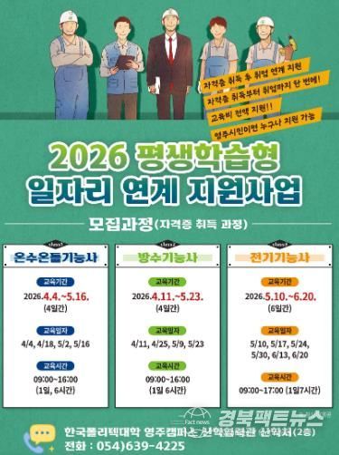 경북팩트뉴스 남유신 기자 | 영주시는 지역 산업 수요를 반영한 실무 중심 직업기술 교육을 통해 시민들의 직무역량을 강화하기 위한 ‘2026년 평생학습형 일자리연계 지원사업’을 추진한다.