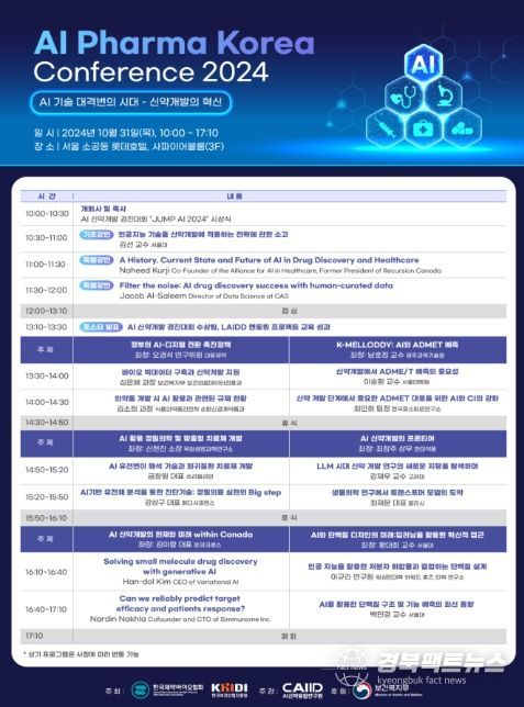 경북팩트뉴스 기자 | 보건복지부와 한국보건산업진흥원, 한국제약바이오협회는 10월 31일 오전 10시 서울 롯데호텔에서'AI Pharma Korea 콘퍼런스'를 개최했다고 밝혔다.