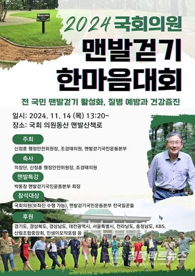 경북팩트뉴스 기자 | 맨발걷기국민운동본부는 국회 신정훈 행정안전위원장, 조경태 의원과 공동 주최로 오는 11월 14일 오후 1시 20분에 국회 의원동산 맨발산책로에서 『2024 국회의원 맨발걷기 한마음대회』를 개최한다.