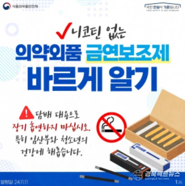 경북팩트뉴스 기자 | 식품의약품안전처는 소비자들이 금연보조 목적에 맞는 제품을 선택하고 안전하게 사용할 수 있도록 의약외품 ‘흡연욕구저하제’와 ‘흡연습관개선제’에 대한 올바른 사용법과 사용상의 주의사항 등 안전정보를 안내한다고 밝혔다.