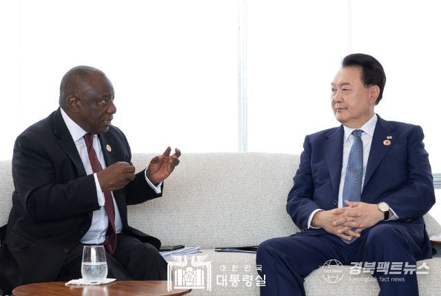 경북팩트뉴스 황혜경 기자 | G20 정상회의 참석을 위해 브라질 리우데자네이루를 방문 중인 윤석열 대통령은 11월 19일 '마타멜라 시릴 라마포사(Matamela Cyril Ramaphosa)' 남아프리카공화국 대통령과 정상회담을 갖고, 양국 간 실질 협력 방안과 지역 및 글로벌 현안에 대해 의견을 교환했다.