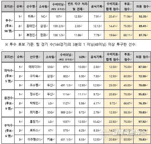수상자들에게는 11월 26일(화) 오후 2시 서울 롯데호텔 월드에서 진행되는 KBO 시상식에서 트로피와 함께 200만원의 상금이 수여된다.