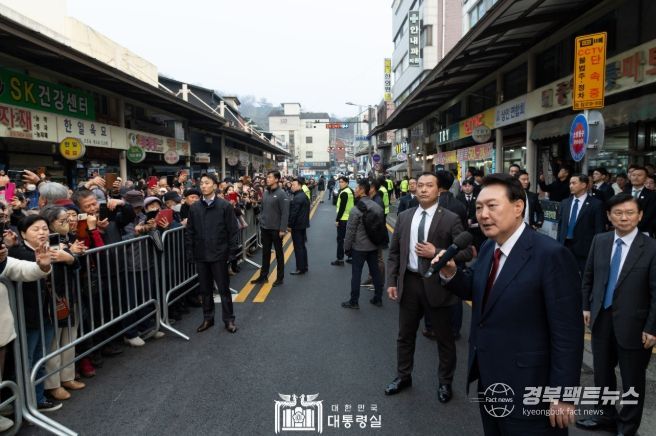 경북팩트뉴스 황혜경 기자 | 윤석열 대통령은 12월 2일 오후 공주산성시장을 방문해 시장 상인 및 지역 소상공인을 격려하는 민생행보를 이어갔다. 공주산성시장 방문은 지난 대선 예비후보 시절인 2021년 8월에 이어 3년여 만이다.