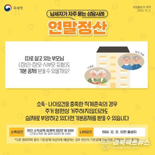 경북팩트뉴스 이경원 기자 | Q. 따로 살고 있는 부모님(장인·장모·시부모 포함)도 기본 공제 받을 수 있을까요?
