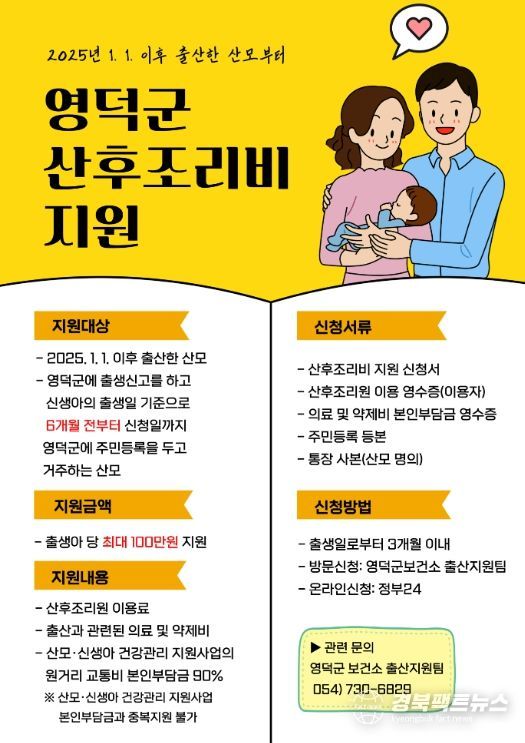 지원 대상은 2025년 1월 1일 이후 출산한 산모로, 영덕군에 출생신고를 하고 출산일 기준 6개월 전부터 신청일까지 영덕군에 주민등록을 두고 거주해야 한다.