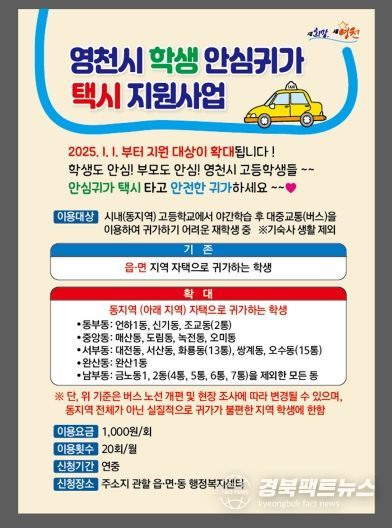 경북팩트뉴스 김영란 기자 | 영천시(시장 최기문)는 2025년 1월 1일부터 학생 안심귀가택시 지원사업을 교통이 불편한 일부 동지역으로 확대 시행한다.