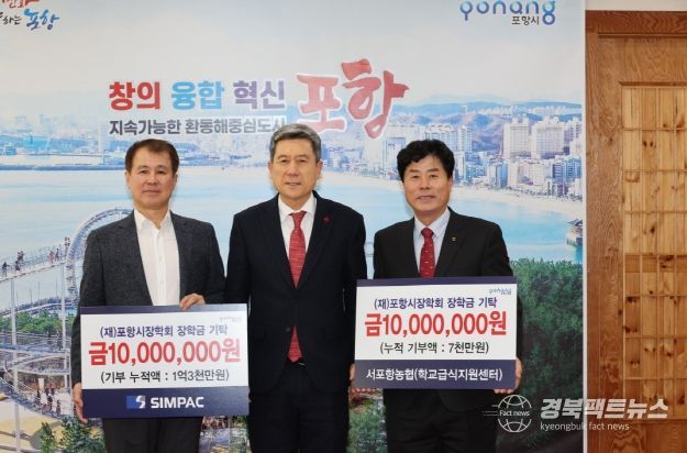 ㈜SIMPAC 1천만원, 서포항농협(학교급식지원센터)에서 1천만원을 포항시 인재 양성 장학금으로 기탁했다.