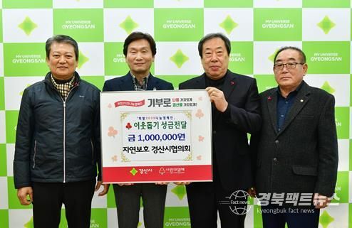 경북팩트뉴스 김영란 기자 | 자연보호 경산시협의회는 24일 경산시청을 방문해 이웃돕기 성금 100만 원을 기탁하며 이웃사랑을 실천했다.