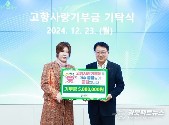 경북팩트뉴스 김영란 기자 | 울진군은 지난 23일, 지역출신 인기 트로트 가수‘풍금’이 고향사랑 기부금 500만원을 기탁하며 고향 울진에 대한 애정을 표했다고 밝혔다.