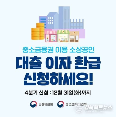 경북팩트뉴스 이경원 기자 | 중소금융권 대출을 이용 중인 소상공인은 12월 31일(화)까지 대출 이자환급 신청이 가능합니다.