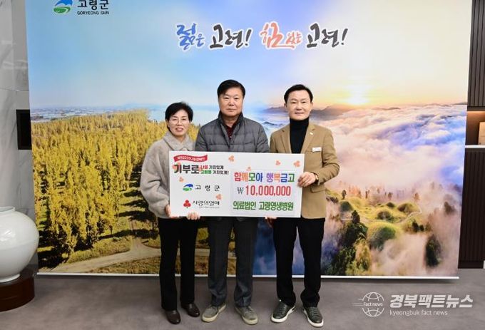 경북팩트뉴스 김영란 기자 | 의료법인 고령영생병원에서 12월 26일 고령군청을 방문하여 '희망2025나눔캠페인'에 동참하고자‘함께모아 행복금고’성금 1,000만원을 기탁 했다.
