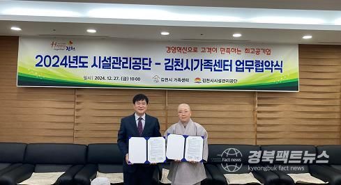 경북팩트뉴스 김영란 기자 | 김천시시설관리공단과 김천시가족센터는 2024년 12월 27일 김천시시설관리공단 본사 회의실에서 업무협약을 체결하고, 지역사회 복지 증진 및 저출생 극복을 위한 협력체계를 구축하기로 했다.