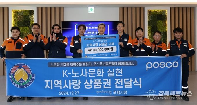 경북팩트뉴스 김영란 기자 | 포항시는 포스코 노동조합이 지난 27일 포항시를 찾아 지역 취약계층을 위해 포항사랑상품권 1억 원을 기탁하며 연말 따뜻한 소식을 전했다고 밝혔다.