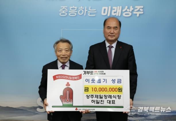 경북팩트뉴스 김영란 기자 | 허일진 상주제일장례식장 대표는 27일 11시 상주시청 시민의 방을 방문하여 희망2025 나눔캠페인 성금 1,000만원을 기탁했다.