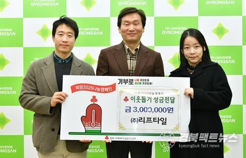 조현일 경산시장은 “어려운 경제 상황 속에서도 이웃 사랑을 실천해 주신 ㈜리프타일 임직원분들께 깊이 감사드리며, 기탁해 주신 성금은 추운 겨울 어려운 이웃들에게 따뜻한 온정을 전하는 데 소중히 사용하겠다”고 밝혔다.
