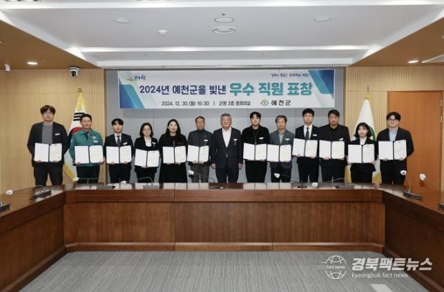 경북팩트뉴스 김영란 기자 | 예천군은 30일, 군청 중회의실에서 2024년 우수 직원에게 상장을 수여하고 노고를 격려했다.