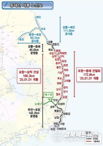 경북팩트뉴스 김영란 기자 | 2025년 1월 1일 동해선 삼척-포항(166.3km) 구간이 개통되며 영천에서 강릉까지 ITX-마음으로 3시간 39분에 이동이 가능해져, 동해안 지역 교통 접근성이 크게 개선될 전망이다.