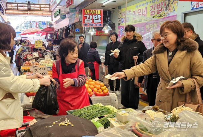 경북팩트뉴스 김영란 기자 | 양금희 경북도 경제부지사는 31일 경제통상국 직원 50여 명과 함께 안동중앙신시장과 안동구시장을 찾아 지역 상인들을 격려하고, 안동 우리요양원을 방문해 위문품을 전달하며, 2024년의 마지막 날을 도민의 일상을 챙기며 보냈다.