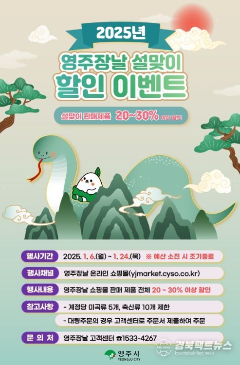 경북팩트뉴스 김영란 기자 | 영주시는 을사년 푸른 뱀의 해, 설 명절을 맞이해 오는 6일부터 24일까지 시 공식 농특산물 쇼핑몰 ‘영주장날’에서 설맞이 대규모 할인행사를 개최한다.