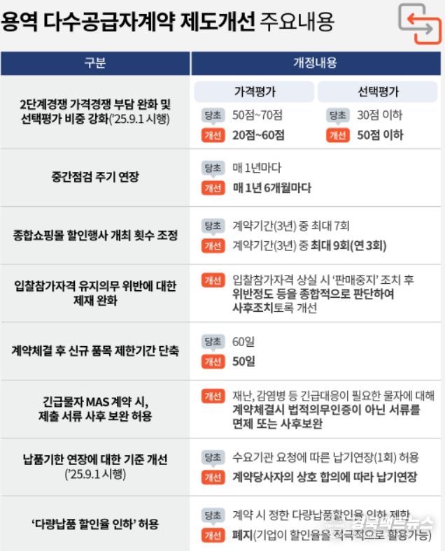 경북팩트뉴스 김영란 기자 | 조달청이 '용역 다수공급자계약 관련 행정규칙 2종'과 관련해 2단계경쟁 시 가격평가 비중 축소 등 조달기업의 부담은 덜어주고, 제도운영의 효율성은 높이는 방향으로 개선해 2025년 1월 6일부터 시행한다.