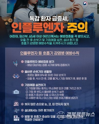경북팩트뉴스 이경원 기자 | 어린이, 임신부, 65세 이상 어르신께서는 예방접종을 꼭 받으시고, 외출 전·후 손씻기 및 기침예절 실천, 실내 환기 등 호흡기 감염병 예방수칙을 지켜주시기 바랍니다.