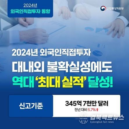 경북팩트뉴스 이경원 기자 | 2024년 외국인직접투자가 대내외 불확실성에도 불구하고