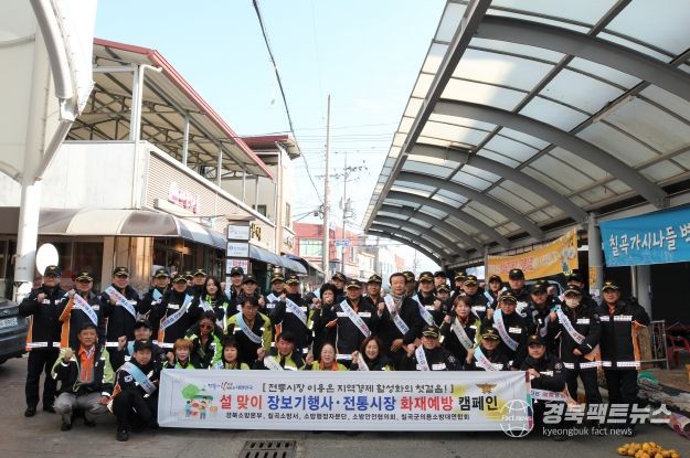 경북팩트뉴스 김영란 기자 | 경상북도 소방본부는 13일, 설 명절을 대비해 칠곡군 약목시장에서 박성열 경북소방본부장이 참석한 가운데 화재 취약 대상 현장 점검과 민생 살리기 장보기 행사를 진행했다.