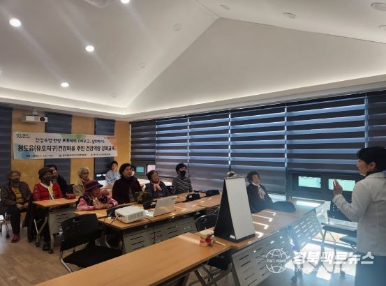 이번 교육은 청도읍(유호지구) 건강마을 주민들에게 다양한 건강정보 제공으로 건강역량을 강화하여, 주민들이 올바른 정보를 습득하고 실생활에 직접 적용할 수 있는 능력을 실천하도록 하기 위해 계획됐다.