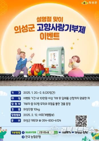 경북팩트뉴스 김영란 기자 | 의성군은 오는 설명절을 맞이하여 기부자들에게 더욱 가까이 다가가는 고향사랑기부제 이벤트를 실시한다.