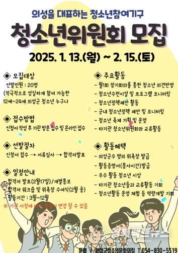 한편, 2025년 의성군청소년위원은 청소년 활동에 적극적이고 성실하게 참여할 수 있는 12세부터 24세 청소년 누구나 지원할 수 있으며, 오는 2월 15일까지 의성군청소년문화의집 방문접수 또는 온라인으로 신청하면 된다.