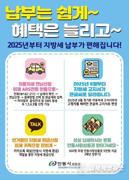 안동시 관계자는 “자동차세 연납 제도는 절세할 좋은 기회”라며 “오는 27일이 임시공휴일로 지정돼 연휴가 길어짐에 따라, 31일 신청이 집중될 수 있으므로 연휴가 시작되기 전에 신청을 부탁드린다”고 전했다.