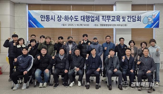 경북팩트뉴스 김영란 기자 | 안동시는 1월 16일 명륜동 행정복지센터 2층 회의실에서 상하수도 대행업체 10개 사 대표자 및 실무자와 맑은물사업국 직원 40여 명을 대상으로 직무능력 향상 및 상호협력 강화를 위한 ‘상·하수도대행업체 직무교육 및 간담회’를 개최했다.