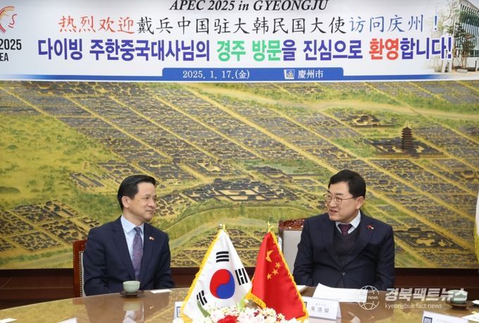 경북팩트뉴스 김영란 기자 | 경주시는 17일 1박 2일 일정으로 다이빙(戴兵) 주한 중국대사 일행을 맞아 APEC 정상회의 준비 상황 점검과 양국 지방정부 간 교류 강화를 논의했다고 19일 밝혔다.