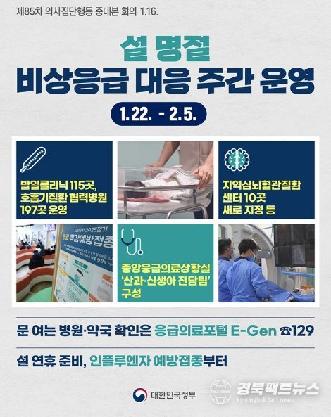 경북팩트뉴스 이경원 기자 | 정부는 16일 제85차 의사 집단행동 중대본 회의를 열고 '설 연휴 대비 응급의료체계 유지 특별대책'을 논의했습니다. 1월 22일부터 2월 5일까지 2주간을 '설 명절 비상응급 대응 주간'으로 지정하고 응급의료를 안정적으로 유지할 수 있도록 대책을 적극 추진합니다.