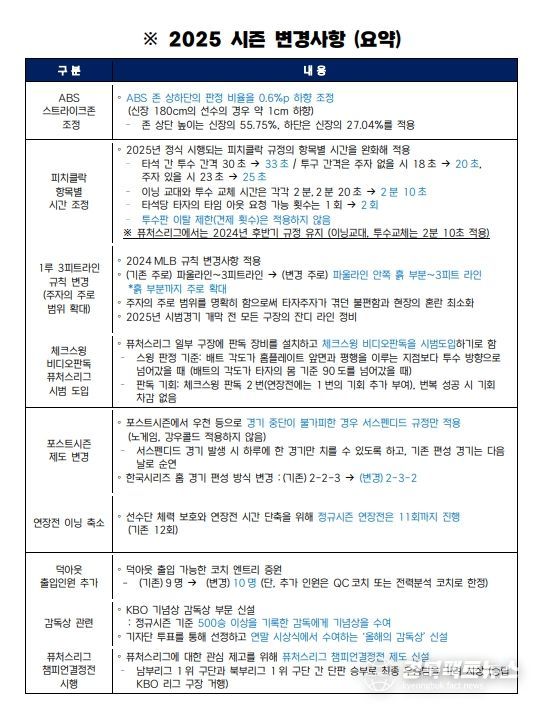 자료에는 KBO가 앞서 발표한 ABS 스트라이크존 조정, 피치클락 정식 시행에 따른 규정, 1루 3피트 라인 규칙 변경 등의 주요 사항이 포함됐다. 또한 퓨처스리그에서 시범 운영하는 체크 스윙 비디오판독 시행에 대해서도 안내했다.