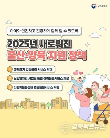 경북팩트뉴스 이경원 기자 | 출산 후 산모와 아이를 위한 의료 및 건강관리 지원부터 신생아부터 초등생까지, 각 가정에 맞는 돌봄 지원으로 양육 부담을 완화하기 위한 2025년 새로워진 출산·양육 지원 정책을 소개합니다.