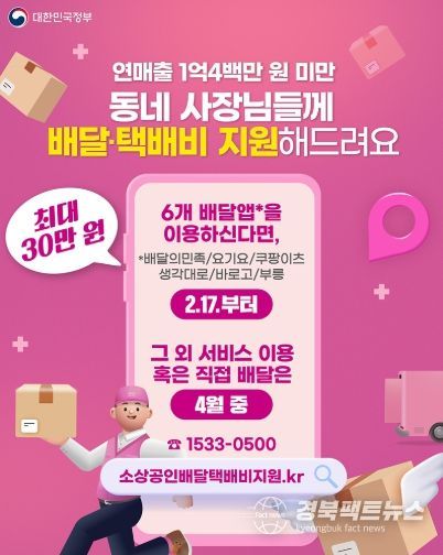 경북팩트뉴스 이경원 기자 | 고물가, 고금리 영향이 더 크실 동네 사장님들의 경영비용을 줄여드리고자 정부가 최대 30만 원 배달·택배비를 지원해 드립니다.(2025년 한시)