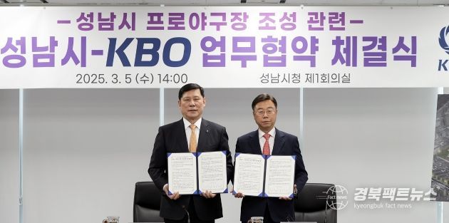 경북팩트뉴스 조현묵 기자 | KBO 허구연 총재와 신상진 성남시장은 5일(수) 성남시 종합운동장을 야구전용구장으로 개조하는 등 프로야구 경기 개최를 위한 성남시 야구전용구장 조성 MOU를 체결했다.