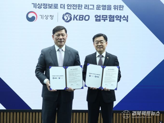 경북팩트뉴스 조현묵 기자 | KBO(총재 허구연)와 기상청(청장 장동언)은 3월 7일(금) KBO 스튜디오에서 업무협약(MOU)을 체결했다.