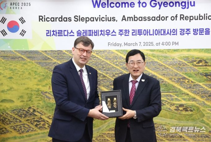 이날 주낙영 경주시장은 슐레파비치우스 대사를 만나 APEC 정상회의 준비 상황을 설명하고, 경주시가 자체 개발한 물정화기술을 소개했다.