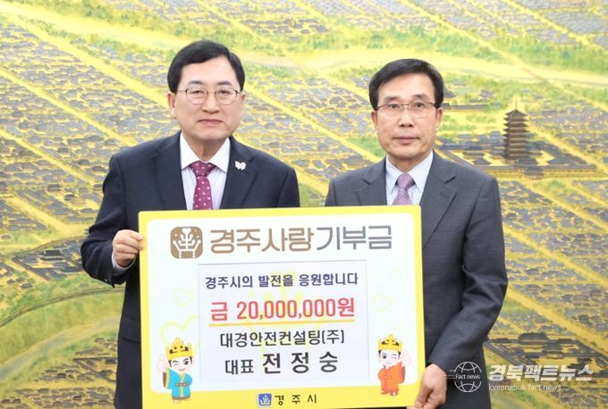 경북팩트뉴스 이영하 기자 | 경주시는 전정숭 대경안전컨설팅㈜ 대표가 경주사랑기부금 개인 최고 한도액인 2000만 원을 기부해 올해 고액기부자 2호에 이름을 올렸다고 9일 밝혔다.