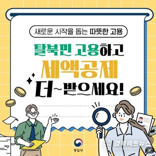 경북팩트뉴스 이경원 기자 | 탈북민의 고용을 촉진하고 탈북민이 안정적으로 일할 수 있도록 탈북민 고용기업에 대한 세제 혜택을 강화하는 「조세특례제한법 시행령」 시행(2.28.)