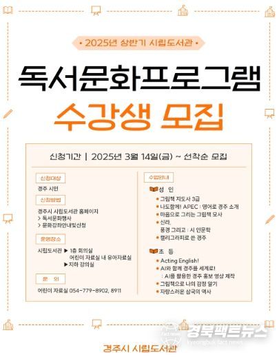 경북팩트뉴스 이영하 기자 | 경주시립도서관은 시민들의 독서문화 진흥과 도서관의 역할 강화를 위해 ‘2025년 상반기 독서문화프로그램’ 수강생을 모집한다.
