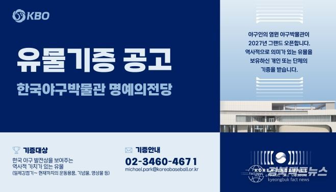 기증 대상은 한국 야구의 발전상을 보여주는 역사적 가치가 있는 유물이며, KBO 정책지원팀 박물관파트 아카이브센터로 전화 또는 이메일을 통해 신청 가능하다.