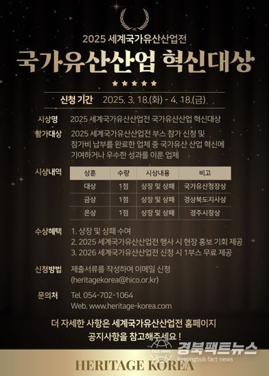 혁신대상 참가 신청은 4월 18일까지이며, 국가유산 관련 기업·기관 누구나 응모할 수 있다. 자세한 내용은 세계국가유산산업전 공식 홈페이지에서 확인 가능하다.