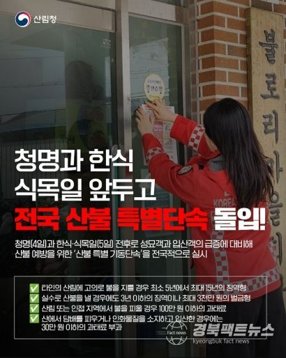 경북팩트뉴스 이경원 기자 | 청명(4일)과 한식·식목일(5일) 전후로 성묘객과 입산객의 급증에 대비해 산불 예방을 위한 '산불 특별 기동단속'을 전국적으로 실시