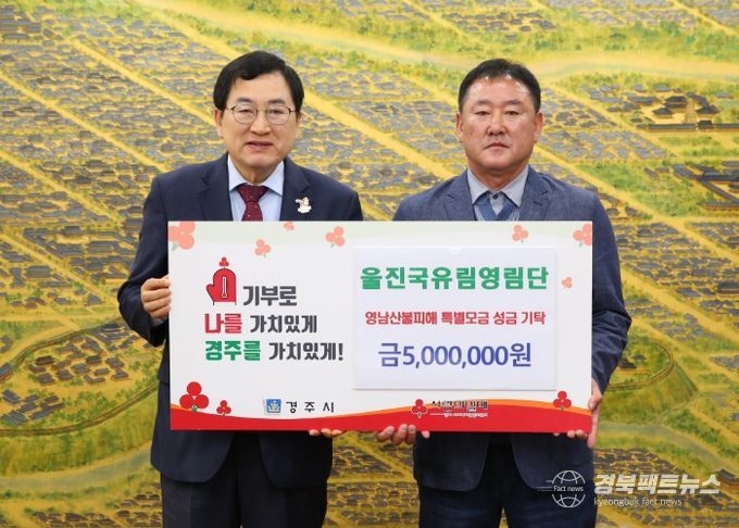 경북팩트뉴스 이영하 기자 | 울진국유림영림원은 2025년 4월 4일, 경주시청을 방문해 영남지역 산불 피해 특별성금 500만원을 기탁했다.