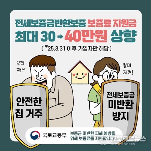 경북팩트뉴스 이경원 기자 | 보증금 미반환 피해 예방을 위해 보증료 지원금을 최대 30 → 40만 원 상향합니다.